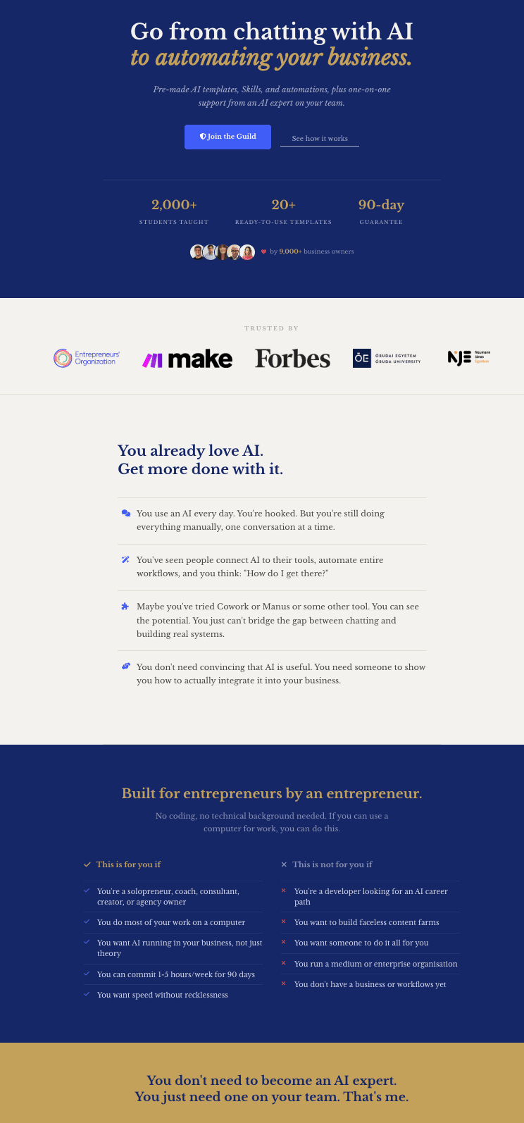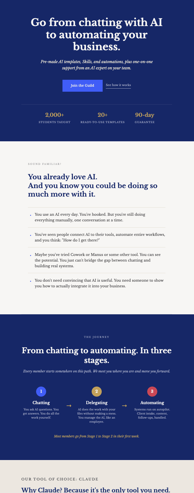 So I don’t yet know how well that is going to work, but I’m sure I’ll figure it out. I didn’t have to touch any of the HTML code so far, and I’ll keep it that way because I’m not THAT technical. I used to pay $47/month for Webflow to host my previous site with CMS. So far, I’m paying Vercel exactly $0/month. So my $200/month Claude Code subscription now only costs $153/month :D Why this matters (and it’s not about websites)A year ago, this project would have been a $3,000-$5,000 agency job and taken 3-4 weeks, and hours of meetings with the designers and the strategists and whatnot. I’ve worked on enough websites to know. And to be honest, I was a bit nervous about it. I’ve seen plenty of AI-generated websites and most of them look like AI slop. You can tell: Perfectly symmetric minimalistic cards, generic stock-photo energy, Inter font, blue-to-purple gradient. They all look the same because the AI was working from the same generic training data with no real context about the brand. The difference was the Skills. Claude Code wasn’t guessing my brand. It had the actual brand guide, the actual voice, the actual offer details. That’s the difference between “generate a website” and “build this specific person’s website with full context.” And that’s the same principle behind everything in the Guild. Generic AI output is what you get when you use AI without context. Specific, useful output is what you get when you give it your Skills. And that's exactly what your business needs. What’s changed in the Paladin GuildSpeaking of the Guild, I’ve restructured a few things based on what I’ve learned from our first cohort of members. The biggest change: the Claude ecosystem is now the core of what we do. Skills, Cowork, plugins, Claude Code (coming soon!). This is where the fastest results are for non-technical people. Make.com automations are still in there (and they’re still the path to full automation), but most members are getting their biggest wins from Skills and Cowork first. So that’s where the focus is now. The other change: unlimited one-on-one calls with me. Not 1 call. Not 3 calls. As many as you need. If you’re stuck on something, if you want my two cents on what to do next with your AI stuff, if you need help picking which template to start with, you book a call and I help you figure it out. That’s it. I did this because the members who got the most value were the ones who actually talked to me. The templates are great, but the 25-minute call where I look at your specific situation and say “start here, skip that, this is what matters for your business” is worth more than any template. So now it’s included for everyone. The only limit is that there are 10 slots for 25 minute calls per week. First come, first served. I currently charge $500/hr for an AI consultation, so this 1:1 access for $200/quarter or $600/year is a steal. I’m going to close doors next Sunday, and only open again once a month from now on. So if you want to join our April cohort, now is the time! Check out my new site for what you get and how I can help you go from chatting with AI to automating your business. Also check it out as a case study for what’s possible with AI today in a day. Talk soon, P.S: I've put together a Claude Crash Course, do you want it? |